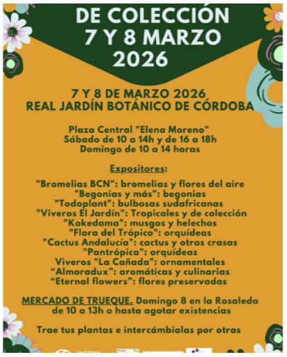 El Real Jardín Botánico de Córdoba celebrará los próximos 7 y 8 de marzo la edición número 6 de la Feria de Plantas de Colección y el sexto Mercado de Trueque de Plantas, organizados junto a la Sociedad de Amigos del Jardín Botánico.