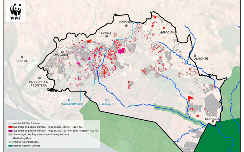 Asimismo, según este análisis, WWF ha subrayado que «a partir del 2004, año en el que se aprobó el POTAD (el plan que ordena el territorio en Doñana y establece los límites donde no se permiten nuevos cultivos de regadío), se multiplicaron las hectáreas en regadío, sabiendo los ilegales que estaban vulnerando la ley y que tendrían que extraer ilegalmente agua del acuífero para cultivar fresas y frutos rojos. De hecho, de acuerdo a las pruebas obtenidas por WWF durante la investigación, el 70% de estas hectáreas de secano no se habían regado nunca antes del POTAD».