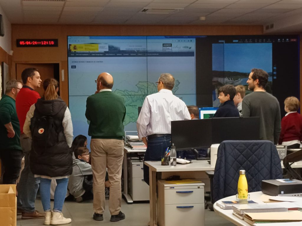 Con posterioridad, los pequeños pasan a la sala de trabajo del SAIH donde conectan por videollamada, a través de una gran pantalla, con el Embalse de Melonares y realizan en directo una prueba de pluviometría.