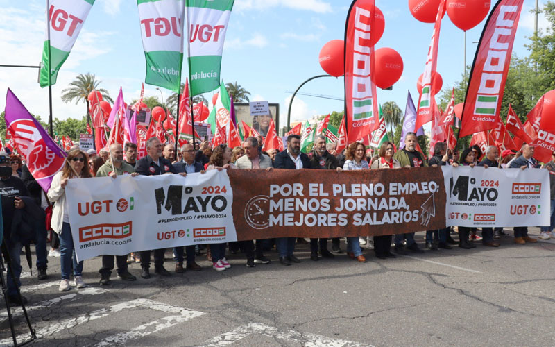 Cerca de 50.000 personas, según UGT-A y CCOO-A, han participado este Primero de Mayo, Día Internacional del Trabajo, en las diferentes manifestaciones convocadas por las dos grandes centrales sindicales en las ocho provincias andaluzas, con la presencia del secretario general de UGT Andalucía, Óskar Martín, y su homóloga en CCOO-A, Nuria López, en la protesta de Córdoba, a la que también ha acudido el líder del PSOE-A, Juan Espadas, y que ha contado con la participación de unas 5.000 personas, según los sindicatos, si bien la Policía Nacional ha cifrado en 1.200 los asistentes.
