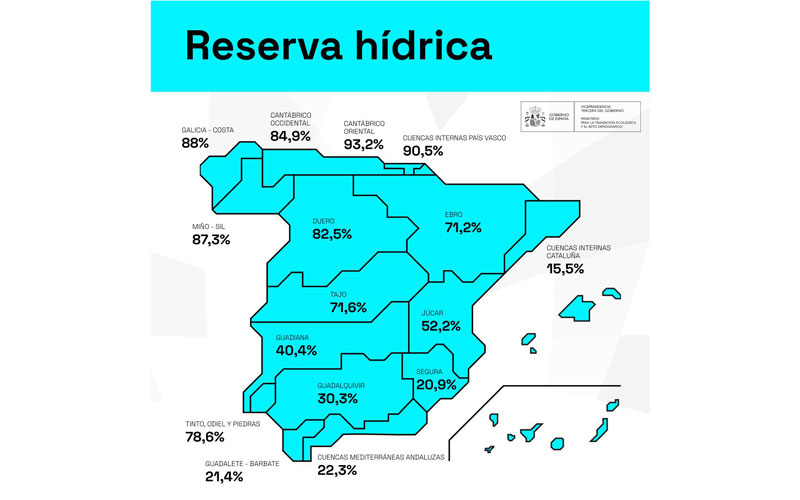 La reserva hídrica española está al 57,8% de su capacidad total. Los embalses almacenan actualmente 32.407 hectómetros cúbicos (hm³) de agua, disminuyendo en la última semana en 11 hectómetros cúbicos (el 0,0% de la capacidad total actual de los embalses).