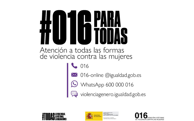 En el 016 se puede pedir asesoramiento sobre los recursos disponibles y los derechos de las víctimas de todas las formas de violencia contra la mujer, así como asesoramiento jurídico de 8 h a 22 h todos los días de la semana, con atención en 53 idiomas y un servicio adaptado a posibles situaciones de discapacidad.