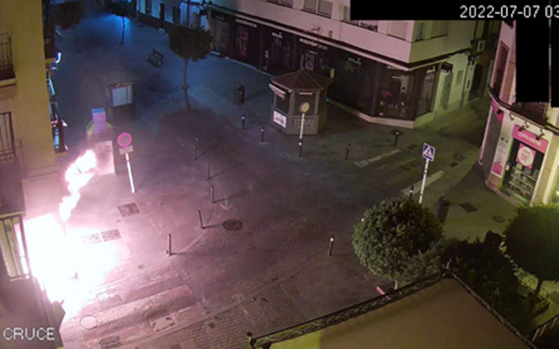 Al realizar el estudio de las imágenes, los agentes pudieron verificar que efectivamente el incendio había sido provocado por una única persona, la cual en un primer momento depositó un montón de material textil en la puerta del establecimiento, rociándolo a continuación con un material inflamable que llevaba en una garrafa de plástico.