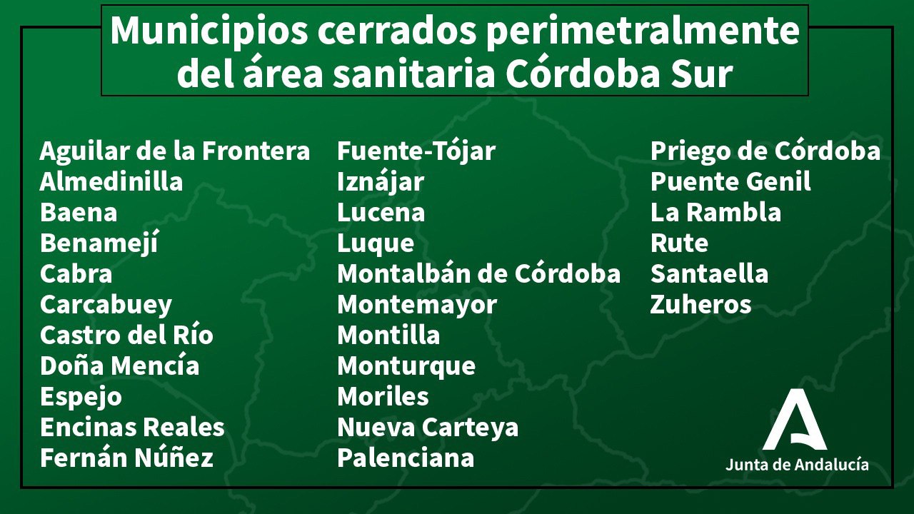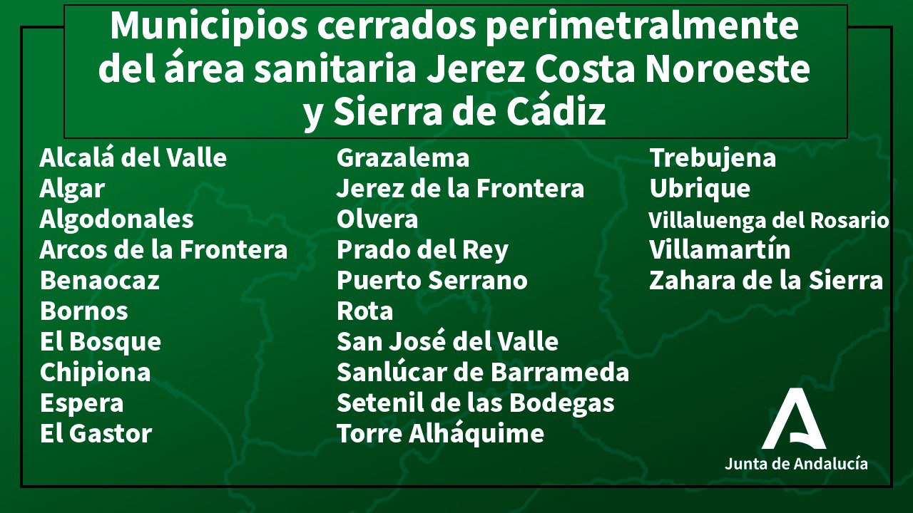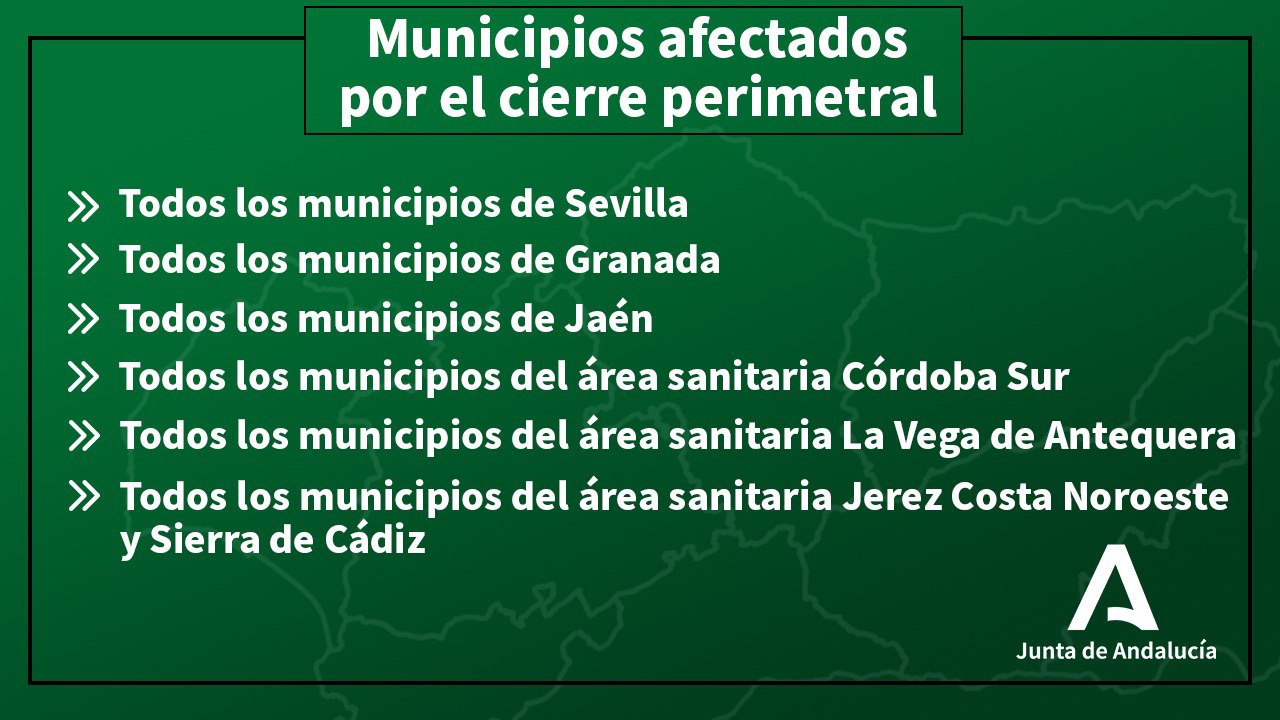 El Gobierno andaluz cierra las provincias de Granada, Jaén y Sevilla y cada una de sus localidades, a consecuencia de la extensión de la pandemia de Covid. Hasta el 9 de noviembre no se podrá viajar entre los municipios de cada provincia, salvo para como en veces anteriores, excepciones. Las medidas usan términos menos restrictivos que el confinamiento total y persiguen aislar los brotes dentro de cada municipio para así poder detectarlo evitando la movilidad en todo lo posible.