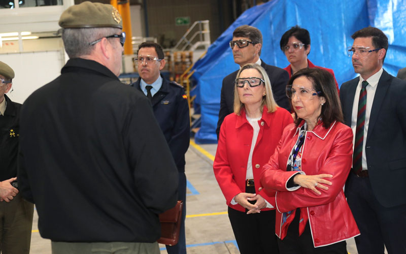 La titular del Departamento ha conocido también los talleres de la zona A dedicados a los sistemas de artillería, y allí el jefe del MALE y la directora de operaciones de Santa Bárbara, “madre del diseño de la pieza de artillería” SIAC Obus de 155, le han explicado en detalle su funcionamiento, con una demostración incluida.