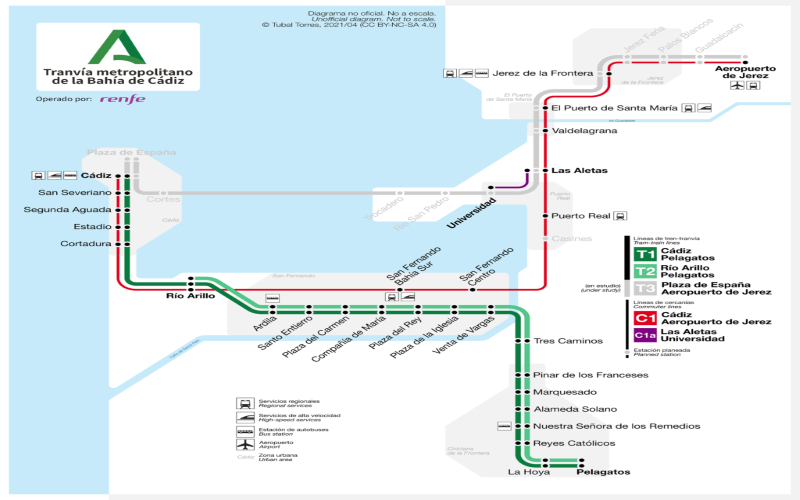 Se trata del primer tren-tranvía de España al circular por vías de nueva construcción entre Chiclana y San Fernando ejecutadas por la Junta y, a partir del apeadero de Río Arillo (San Fernando), por la Red Ferroviaria de Interés General hasta Cádiz capital, en la estación de la Plaza de Sevilla.