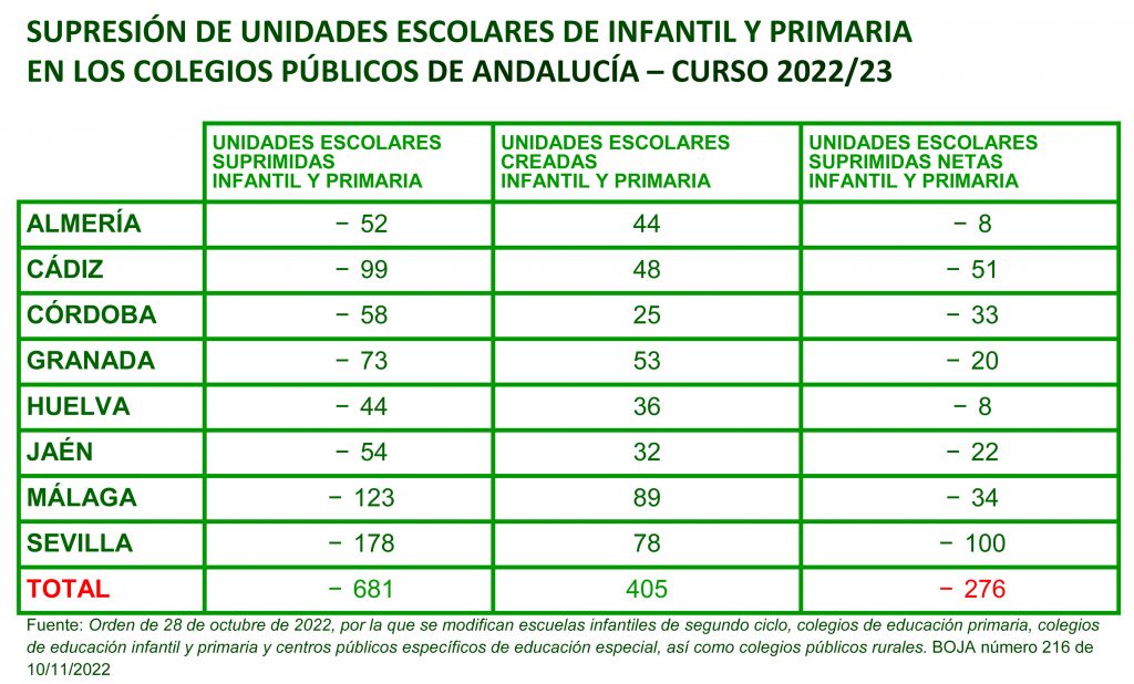 Con las supresiones de este curso, la cifra es ya de 1.457 unidades escolares menos en la estructura del sistema educativo público de Andalucía.