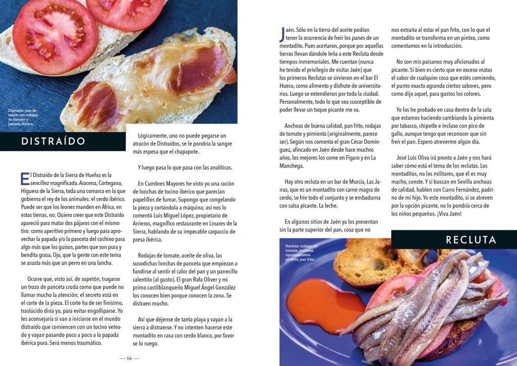 Desde el Piripi, tan presente en la Semana Santa sevillana hasta la Bicicleta murciana, pasando por Distraído de la Sierra de Huelva, el legendario Dobladillo de Cádiz o el zaragozano Guardia Civil, con sus sabrosas “anchodinas” y su pepinillo en vinagre… si de verdad le pierde la cultura del buen sabor no puede pasar por alto este verdadero tratado gastronómico con el montadito por protagonista.