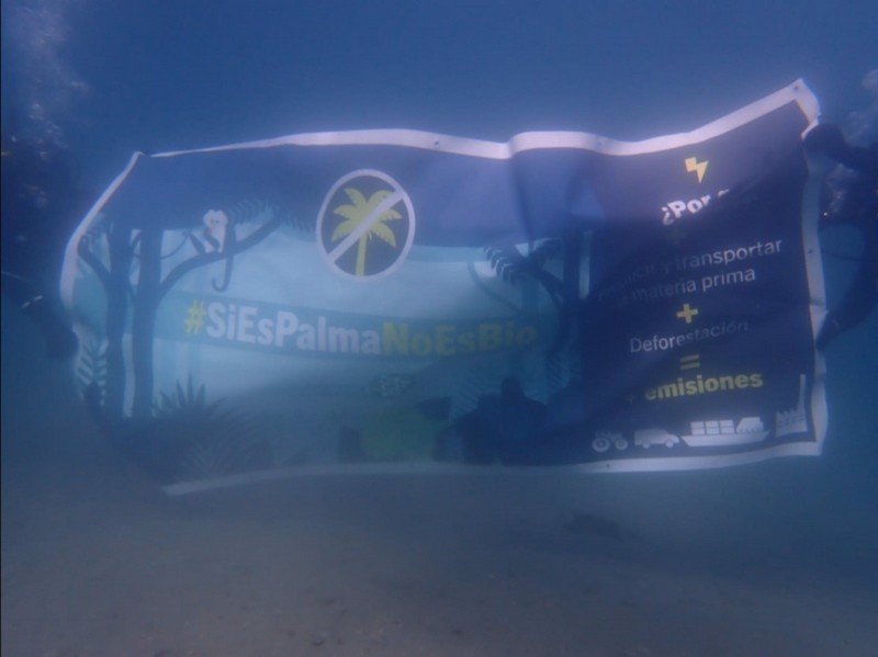 Un grupo de buzos han realizado una protesta submarina en los fondos del mar de la Bahía de Algeciras desplegando una pancarta contra el uso del biodiesel fabricado a partir del aceite de palma.